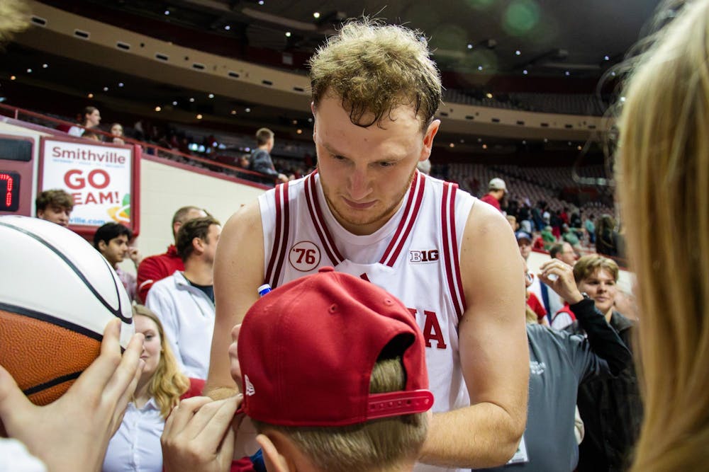 Redshirt senior forward Tucker DeVries signs his autograph for a fan after the game against Minnesota on March 4, 2026, at Simon Skjodt Assembly Hall in Bloomington. It was DeVries' last regular season game in Assembly Hall.