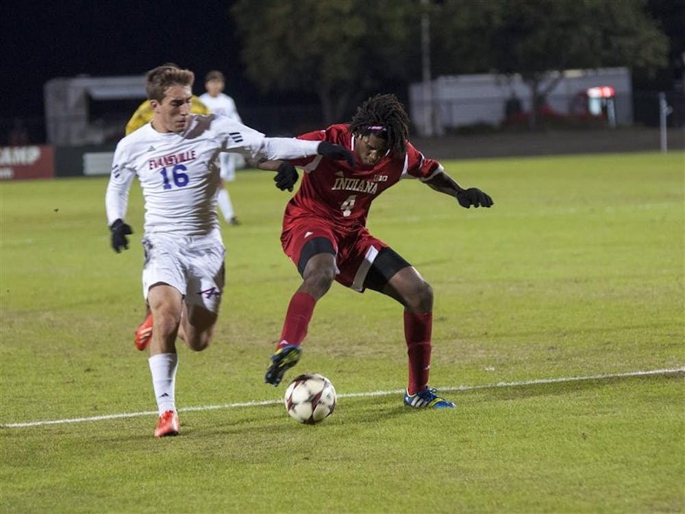Sophomore Femi Hollinger-Janzen fights for position during the match against Evansville Wednesday at Bill Armstrong Stadium. Haley Ward