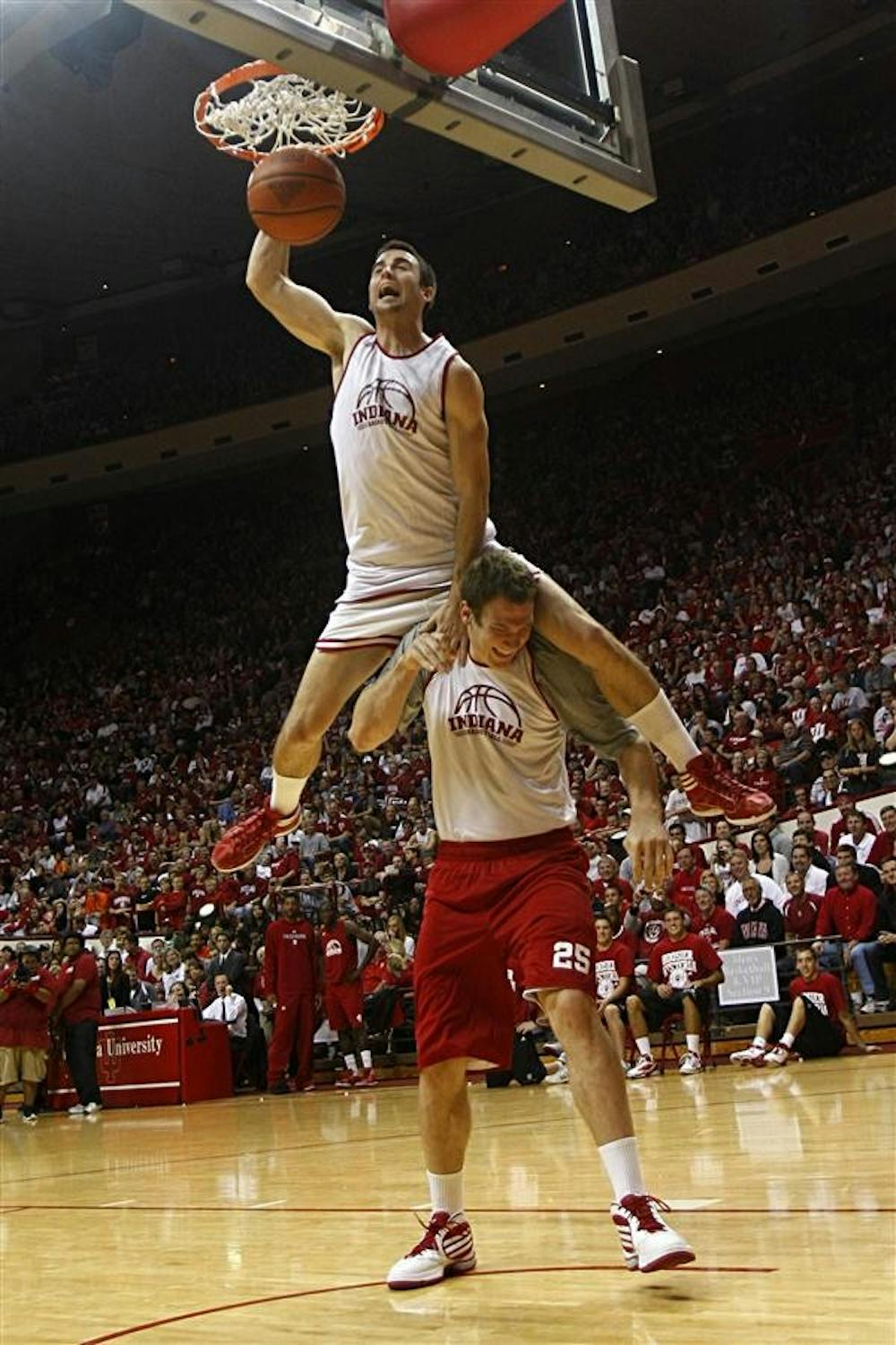 Sophomore Forward Will Sheehey dunks against teammate Tom Pritchard during the dunk contest Saturday at Hoosier Hysteria at Assembly Hall. Mark Felix