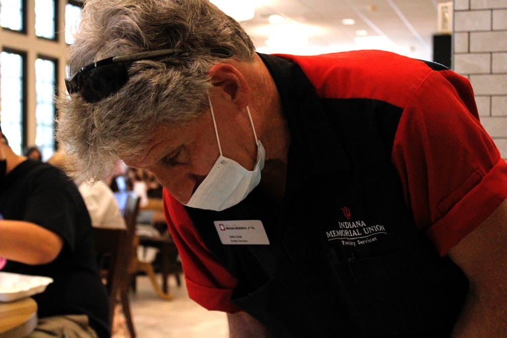 IU facility services worker John Zink leans over to change a trash bag Sept.24, 2021, inside the Indiana Memorial Union dining hall. John was eight hours into his workday that began at 3 a.m. and ended at 1:30 p.m.