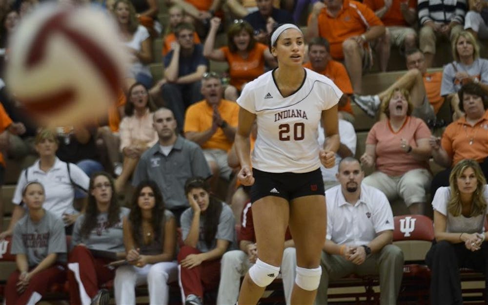 Senior middle blocker Samantha Thrower looks across the court as the Bowling Green crowd behind her cheers and IU fans watch quietly during the Hoosiers' 3-1 loss to Bowling Green on Saturday at University Gym. Steph Langan