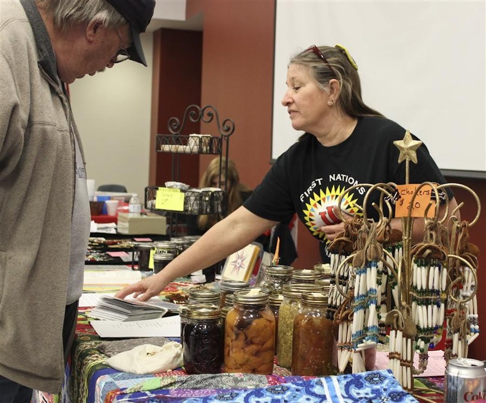 Morning Lark Baskett speaks to attendees about the benefits of eating natural foods at a booth set up during the Native American Health and Wellness Community Dance Saturday at the Union Street Center Auditorium.