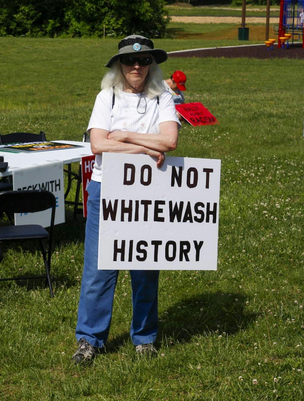 A protester stands in a park outside the Ellettsville Town Hall holding a sign that reads, "DO NOT WHITEWASH HISTORY" Monday, May 19. A group of at least 60 protesters gathered before the town hall meeting to condemn Beckwith's remarks about the Three-Fifths Compromise.