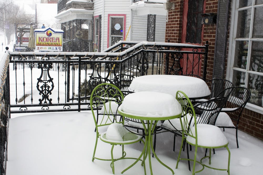 Snow covered furniture appears outside of Burma Garden on Monday on Fourth Street. Bloomington is expected to receive as much as a foot of snow between Monday afternoon and Tuesday morning. Katharine Khamhaengwong