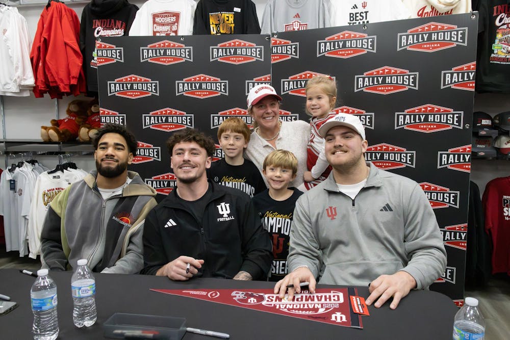 A family takes a photo with Elijah Sarratt, senior linebacker Aiden Fisher and redshirt junior offensive lineman Carter Smith (left to right) at a meet and greet Jan. 23, 2026, at Rally House in Bloomington. Fans needed a wristband to meet the players and get an autograph.