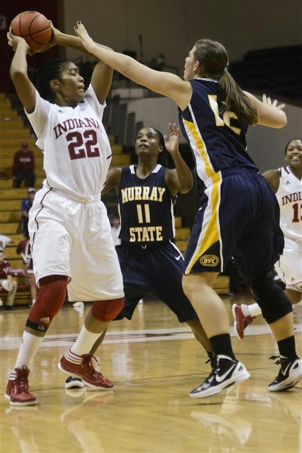 Junior center Sasha Chaplin attempts to pass the ball during the Hoosiers' 70-67 victory against Murray State Monday at Assembly Hall.