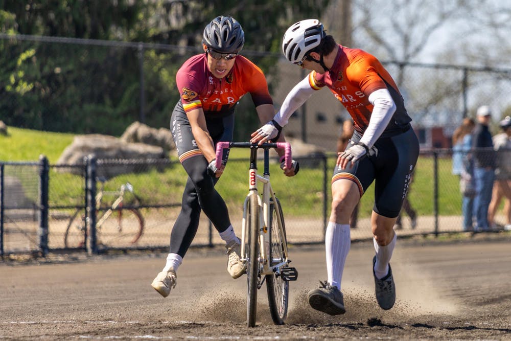 Members of Bears Cycling complete an exchange March 28, 2026, at Bill Armstrong Stadium in Bloomington. The team qualified for the Little 500 race with a time of 02.30.652 seconds. Briana Pace