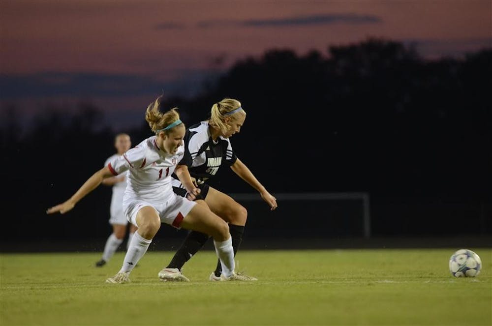 Sophomore midfielder Krisitin Leist fights for possession of the ball during the Hoosiers' 3-1 win against Indiana State University on Wednesday at Jerry Yeagley Field.
