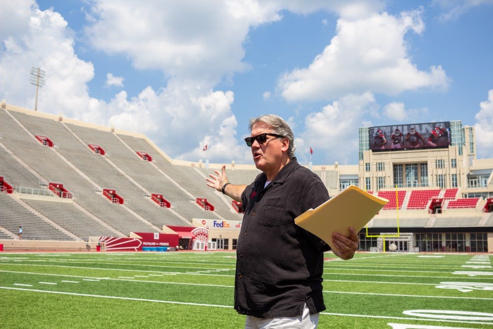 IU Athletic Director Fred Glass prepares to give a tour of the new south end zone complex July 25 at Memorial Stadium. The new complex adds 66,000 square feet, which includes a new scoreboard, leadership and life skills center and nutrition center.