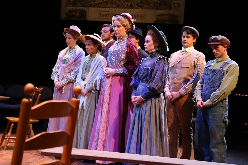 From left to right, Karen Janes Woditsch, Marya Grandy, Jimmy Hogan, Glynnis Kunkle-Ruiz, Max Weinberg, Katie Swaney, Matthew Weidenbener and Justin Smusz rehearse for the 2018 IU Summer Theatre production of "Our Town." Marya Grandy and Karen Janes Woditsch are appearing in the show courtesy of Actors’ Equity Association.