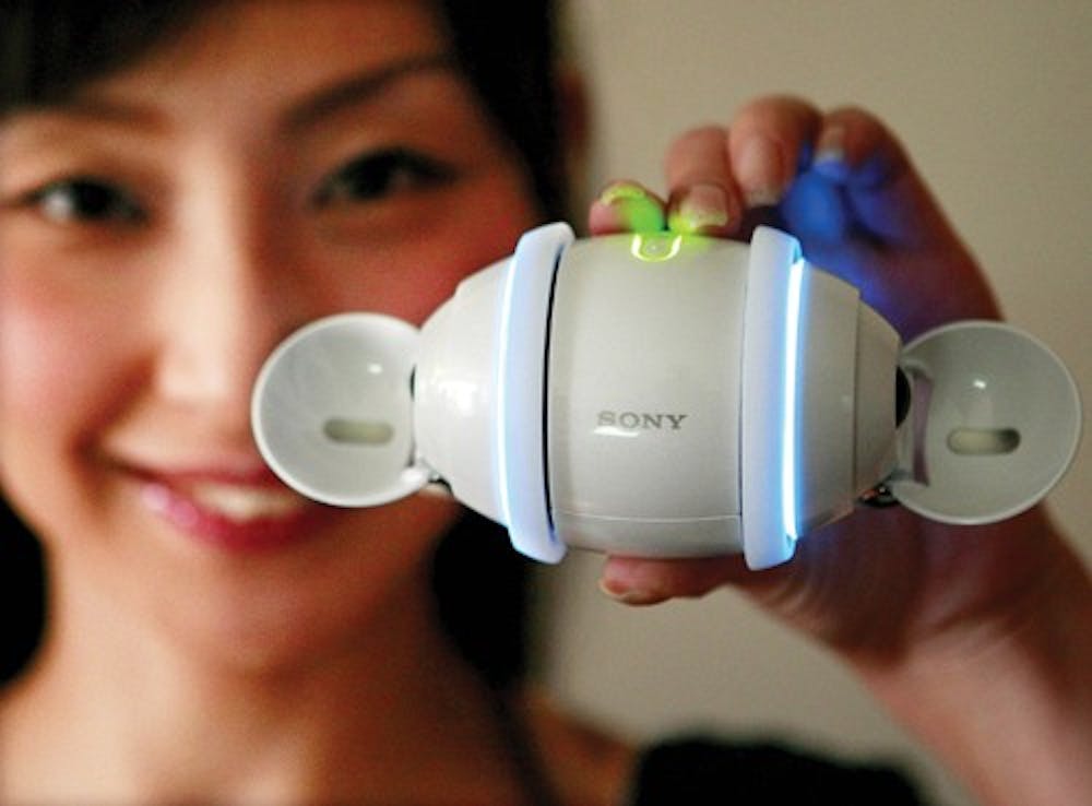 A model shows Sony Corp.'s new rolling egg-shaped digital music player swivels in Tokyo, Monday, Sept. 10, 2007. The 40,000 yen (US$354; euro258), 300 gram (11 ounce) Rolly, set to go on sale in Japan Sept. 29, comes with stereo speakers, 1 Gigabyte of internal flash memory and a battery good for about five hours of music. Overseas sales are still undecided. The smooth white gadget, small enough to sit on a palm, has sensors that recognize which way is up, allowing volume to be controlled by turning the player clockwise or counterclockwise, and tunes to be switched by pushing or pulling it on the floor. (AP Photo/Itsuo Inouye)