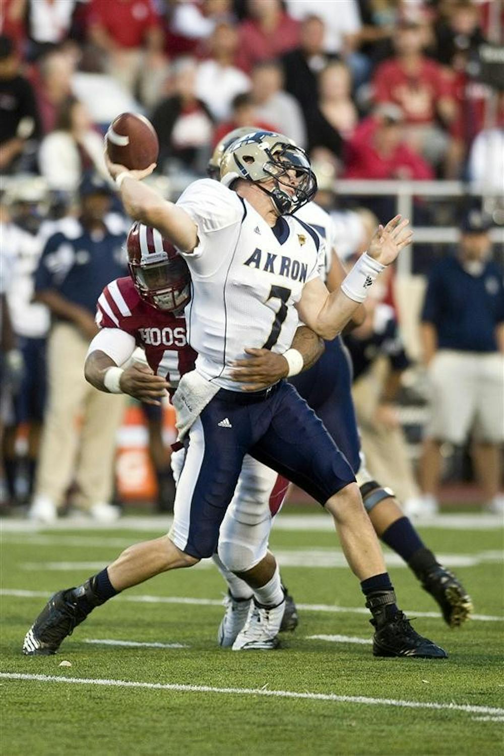 Junior defensive end Darius Johnson hits Akron quarterback Patrick Nicely as he throws during IU's 35-20 win against the Zips on Sept. 25 at Memorial Stadium. Peter Stevenson