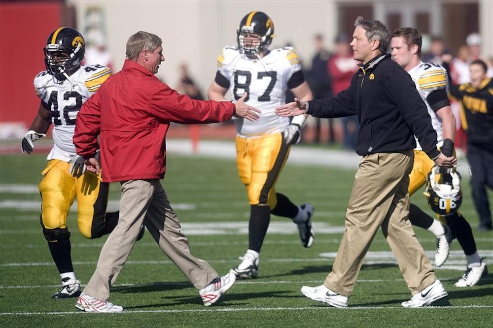 IU coach Bill Lynch shakes hands with Iowa coach Kirk Ferentz at the end of IU's 18-13 loss to the Hawkeyes on Saturday at Memorial Stadium. Peter Stevenson