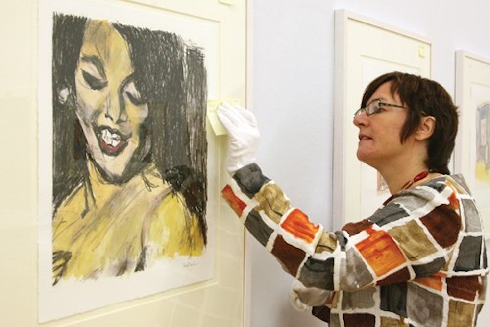 Curator Kerstin Drechsel prepares "Portrait of a smiling woman" by Bob Dylan for an exhibition in the Art Collections in Chemnitz, eastern Germany, Monday, Oct. 22, 2007. 170 watercolour and gouache paintings by Bob Dylan will be shown under the heading "The Drawn Blank Series" exclusively from Oct. 28 till Feb. 3, 2008 in the singer's first ever museum exhibition. (AP Photo/Matthias Rietschel)