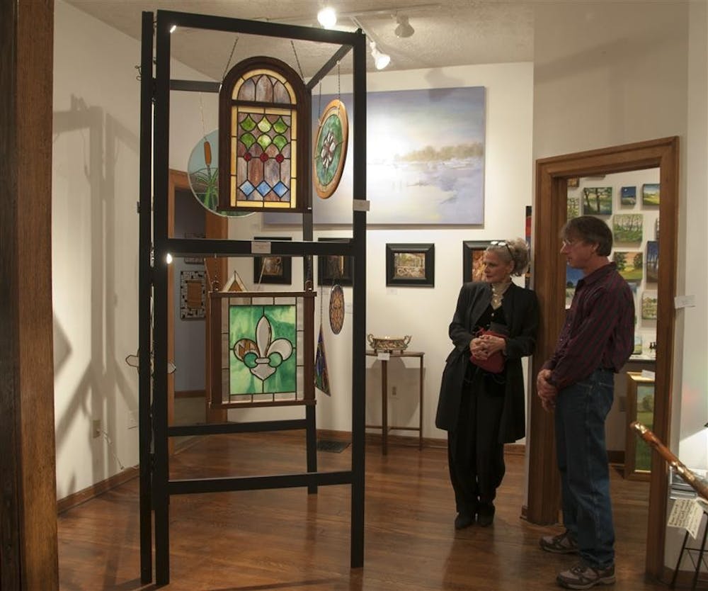 Stain glass artist Glenn Kirsch talks to a customer about his work Friday evening at Venue Fine Art and Gifts.