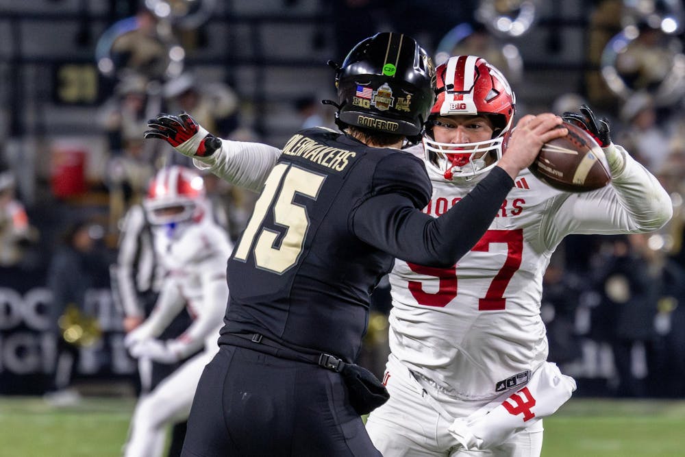 Indiana sophomore defensive lineman Mario Landino attempts to block a pass during the game against Purdue on Nov. 28, 2025, at Ross-Ade Stadium in West Lafayette, Indiana. Landino had one tackle in the game.