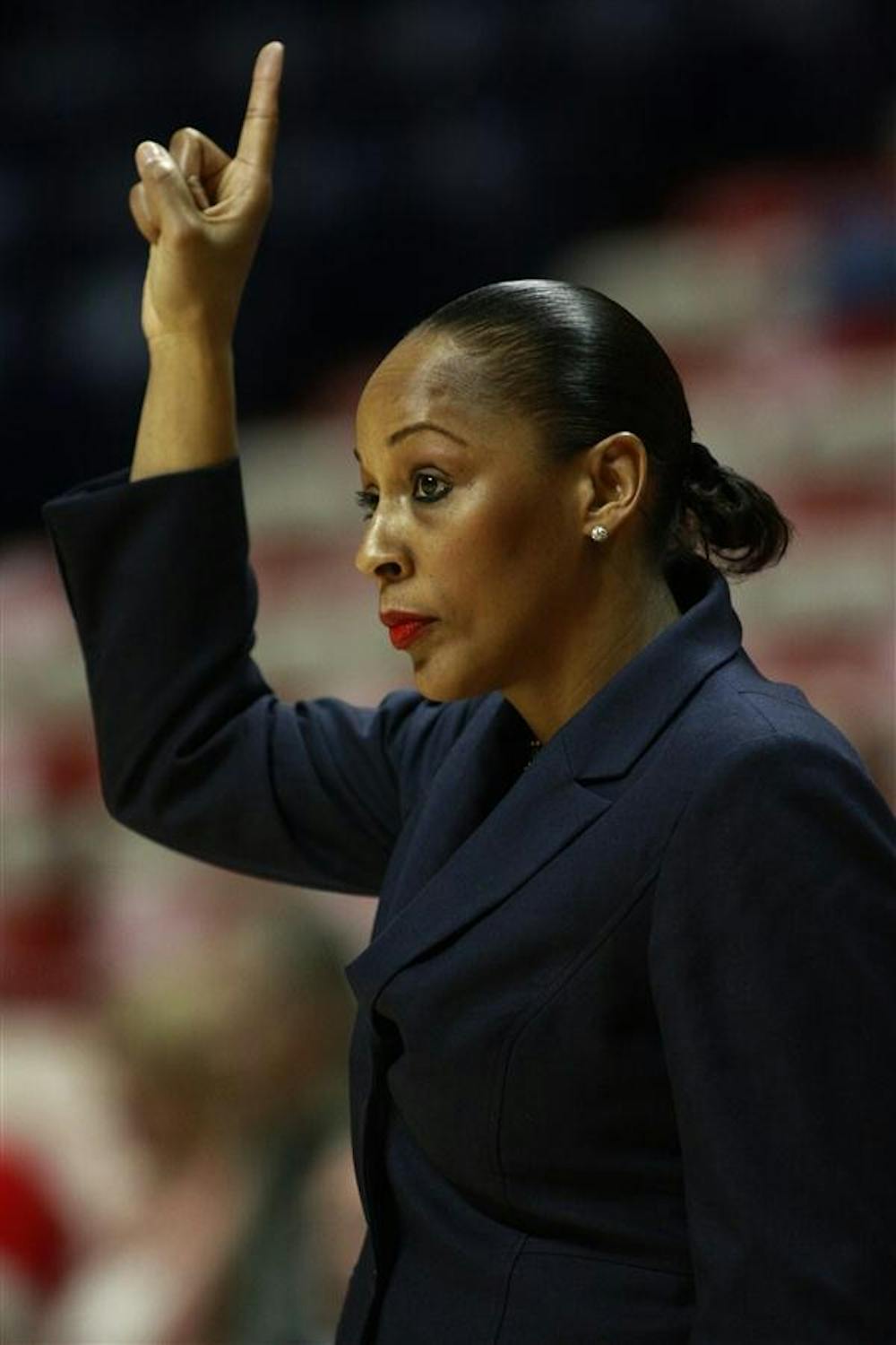 IU Coach Felisha Legette-Jack motions for a play during IU's 62-60 win against Wisconsin on Thursday at Assembly Hall.