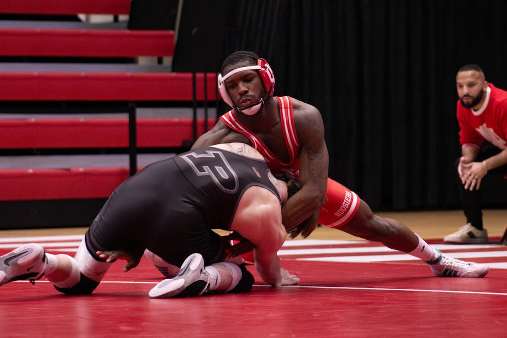 Redshirt junior Tyler Lillard stays on top of his opponent in the match against Purdue on Feb. 20, 2026, at Wilkinson Hall in Bloomington. Lillard lost his match 4-3. Kaitlyn Stacy