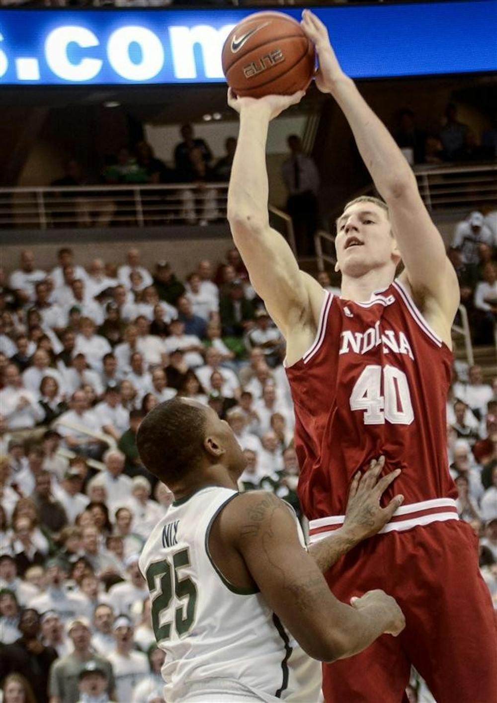 Sophomore forward Cody Zeller jumps to shoot a basket during IU's 72-68 win against Michigan State on Tuesday at Breslin Center.