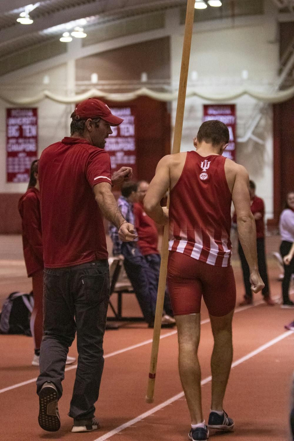 Senior pole vaulter Adam Coulon talks to his assistant coach Jake Wiseman after jumping Jan. 24 in Gladstein Fieldhouse. Wiseman represented Indiana at the NCAA Championships in a decathlon before coaching at IU.