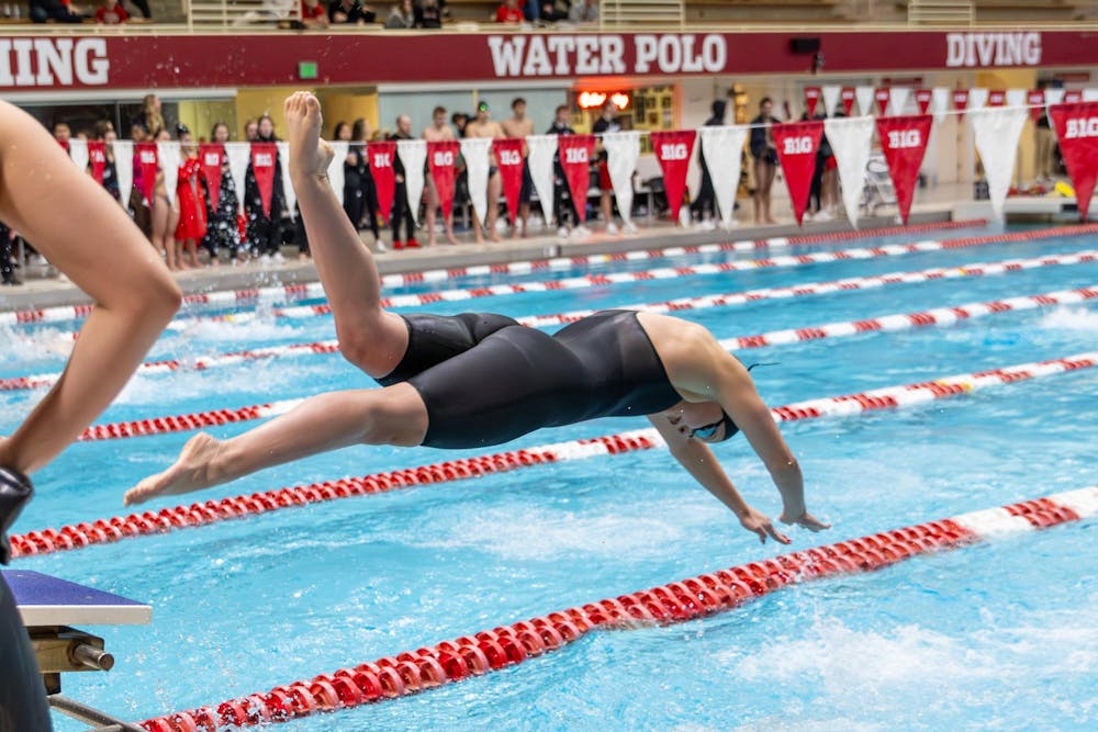 An Indiana women's swimmer leaps into the water to continue the second leg of the women's relay against the University of Louisville on Jan. 30, 2026, at the Counsilman-Billingsley Aquatic Center in Bloomington. An Indiana team took the top spot in the women's 400-yard freestyle relay.