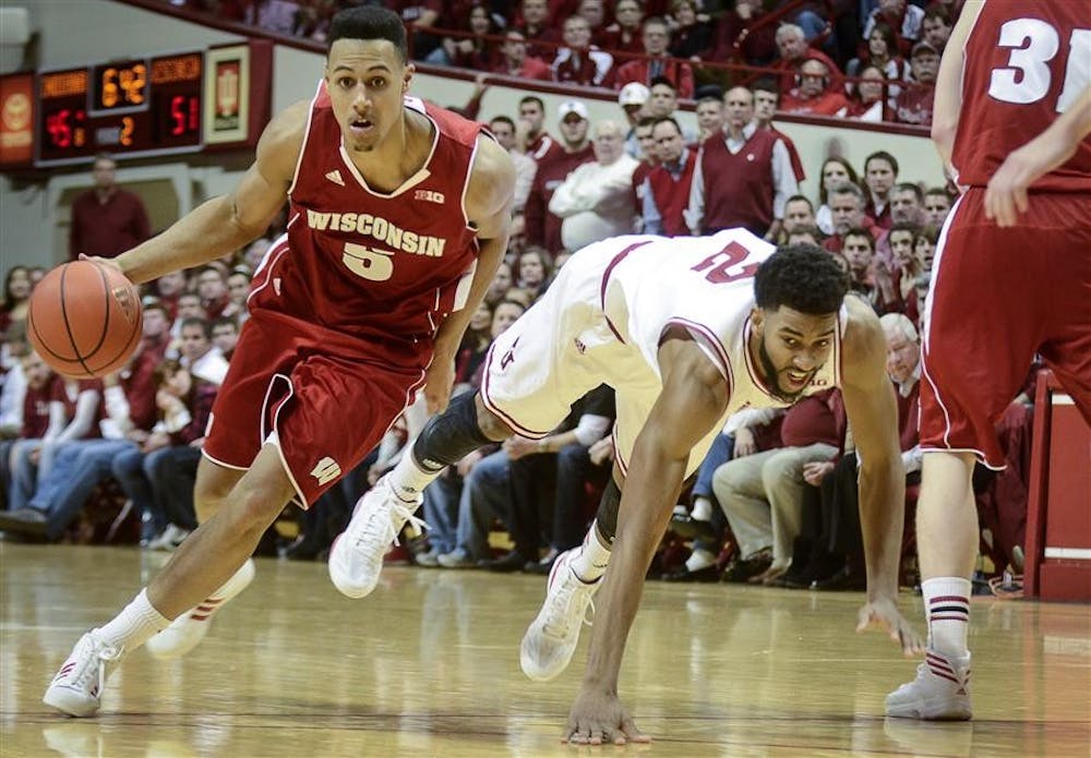 Senior forward Christian Watford falls to the ground as Wisconsin player Ryan Evans dribbles away during the Hoosiers' 64-59 loss to Wisconsin on Tuesday at Assembly Hall. Steph Langan