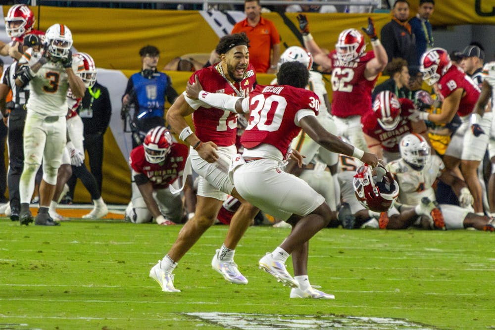 Senior wide receiver Elijah Sarratt (left) and freshman linebacker PJ Nelson (right) celebrate following the national championship game Jan. 19, 2026, at Hard Rock Stadium in Miami Gardens, Florida. Sarratt had three catches for 28 yards in the game.