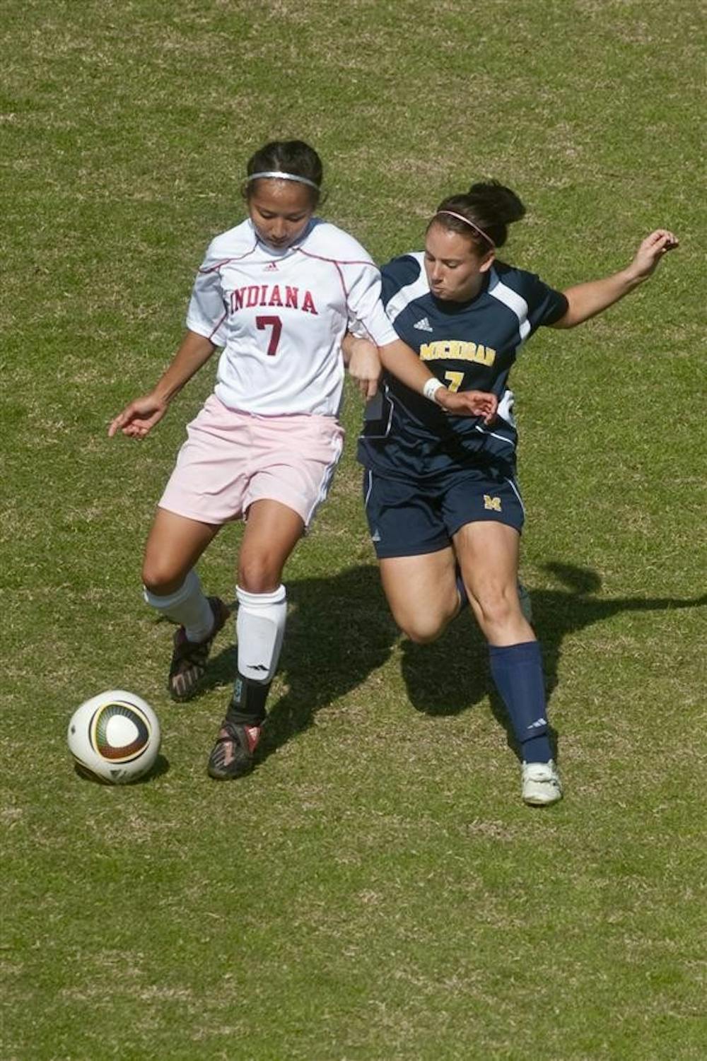 Freshman midfielder Lisa Nouanesengsy holds off the challenge of Michigan's Meghan Toohey during IU's 2-1 loss to the Wolverines on Sunday at Bill Armstrong Stadium. Peter Stevenson