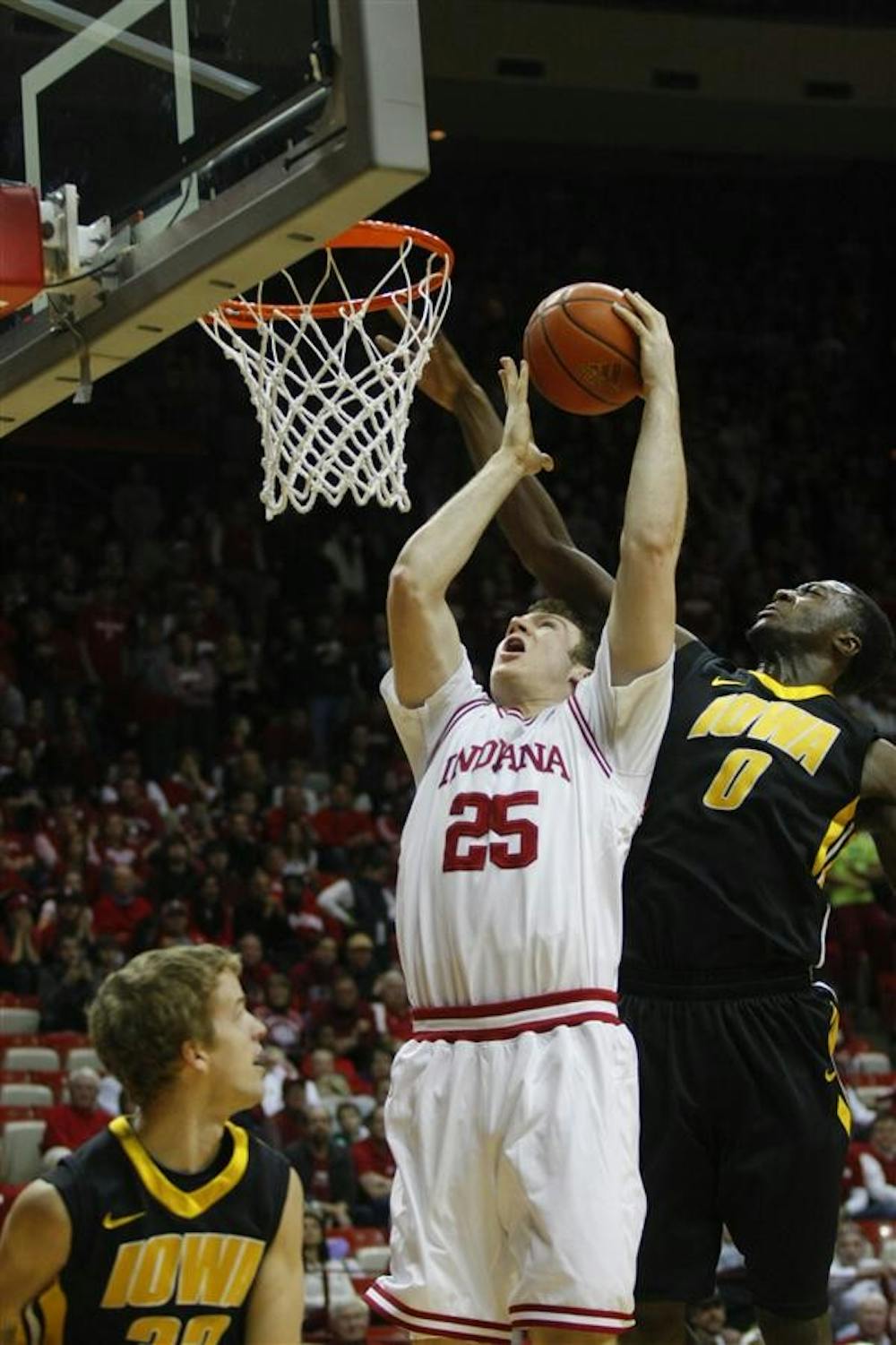 Senior forward Tom Pritchard tries to put back a rebound during IU's 103-89 win against Iowa on Sunday at Assembly Hall. Mark Felix