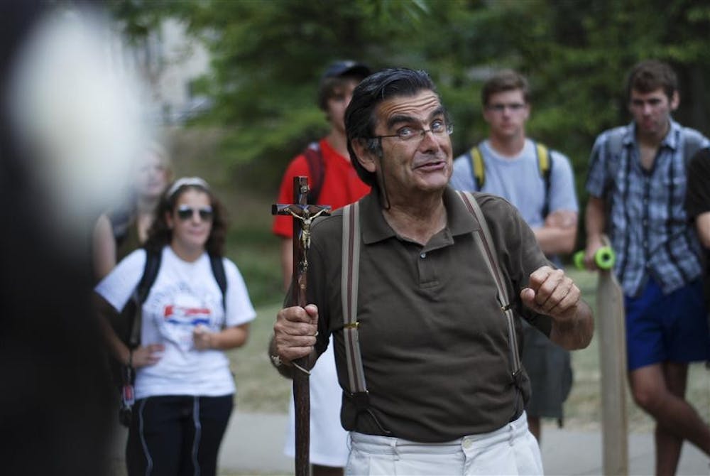 Brother Jed Smock makes a point to a student listening to him preach Wednesday on Forrest Ave. Smock, a traveling minister claiming membership in the United Methodist Church, preached on campus Tuesday and Wednesday on his yearly tour around college campuses. Smock brought up topics like masturbation, the need for forgiveness and pre-marital kissing in what he deemed his Christian message. Students gathered around him in between classes asked him questions, scoffed and, in freshman Braden Mishler's case, called him a Pharisee.