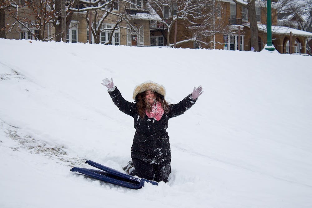 Junior Alexis Kane sleds down a hill Tuesday in Dunn Meadow. Kane is from Dallas, Texas, and Tuesday was her first time sledding.
