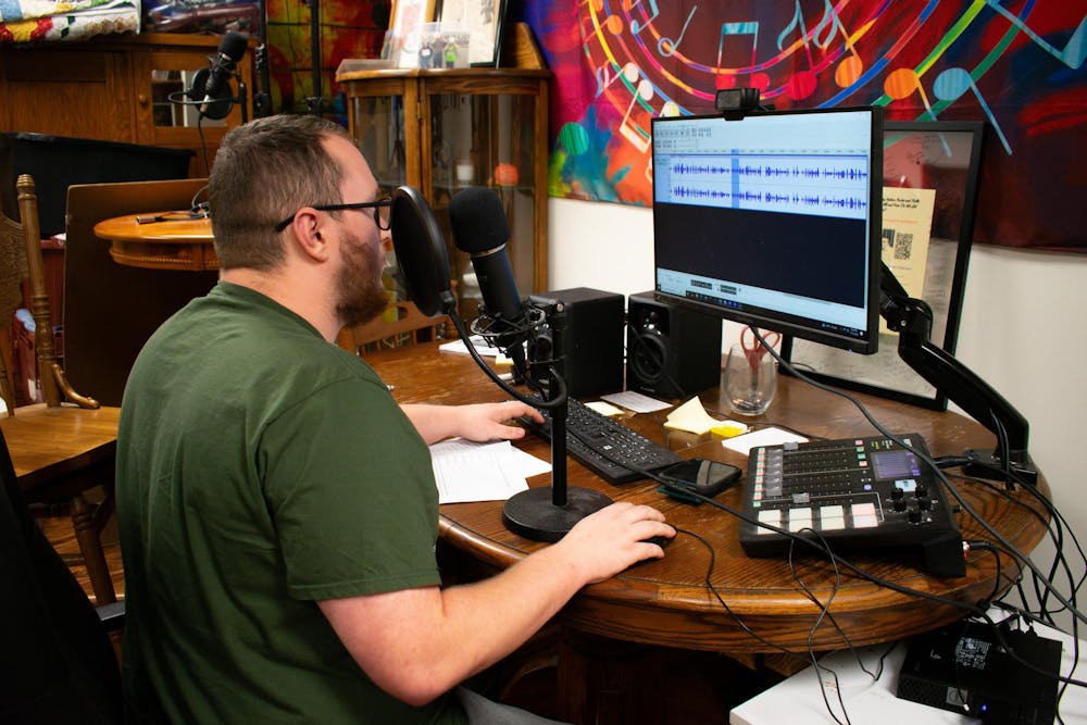 Sam Mitchell records the voiceover intro to his podcast Nov. 19, 2025, at his Owensburg, Indiana, home. He received podcast equipment for his 16th birthday.