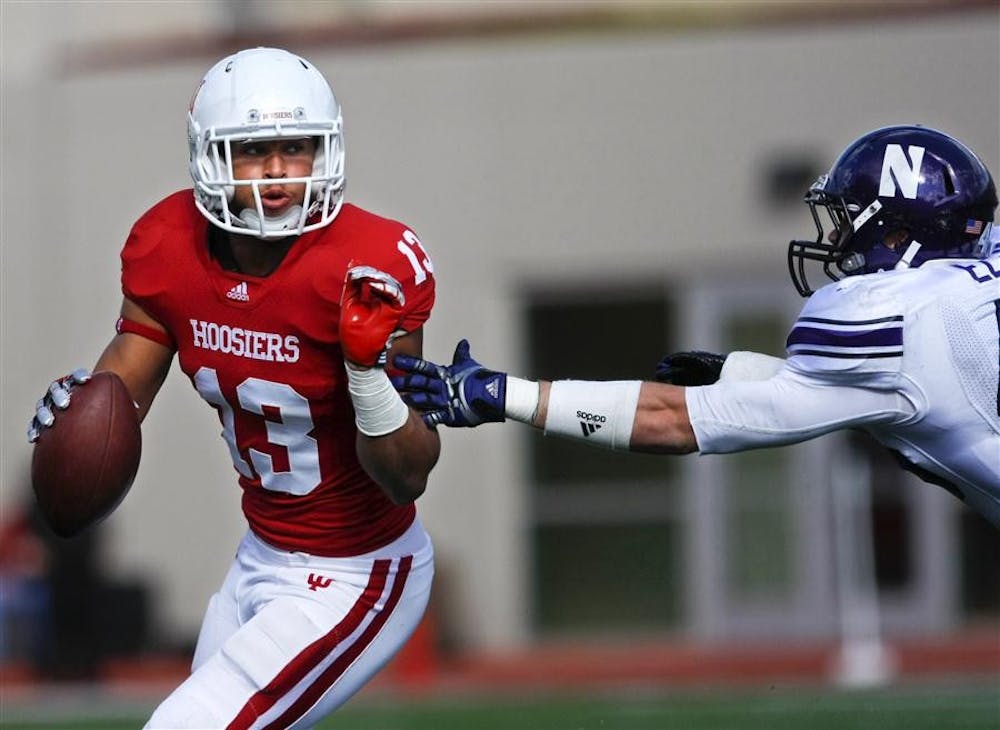 IU Sophomore wide receiver Kofi Hughes dodges the outstretched arms of a Northwestern defender Saturday at Memorial Stadium.