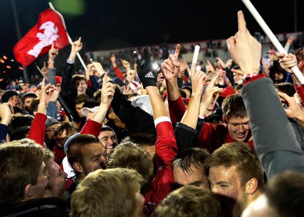 Supporters and members of the IU men's soccer team celebrate after IU defeated Notre Dame on Nov. 30 at Bill Armstrong Stadium. Senior midfielder Austin Panchot scored the only goal of the game to help advance IU to the semifinals of the NCAA Tournament in Santa Barbara, California.