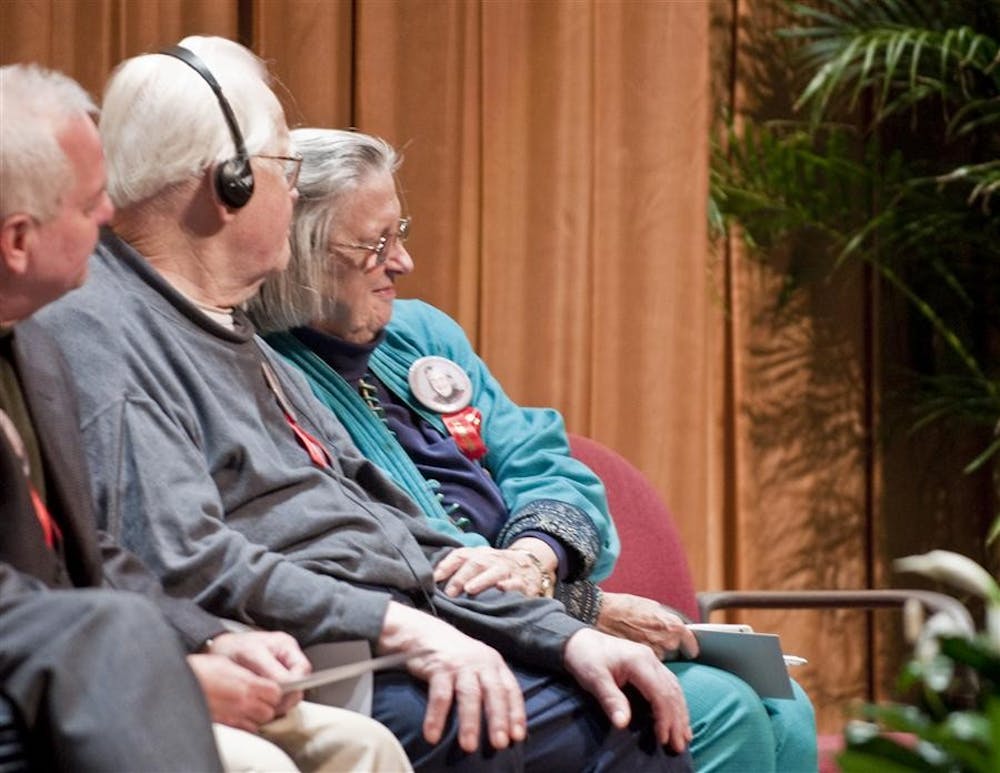 Vincent and Elinor Ostrom listen as friends and colleagues speak Wednesday, Dec. 2 during a celebration of Ostrom's work at the IU Auditorium. Biz Carson