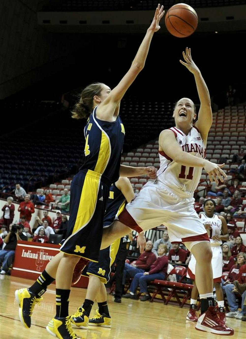 Junior guard Andrea Newbauer tries to shoot over a Michigan defender on Thursday night at Assembly Hall. Hoosiers lost 61-43. Mark Felix