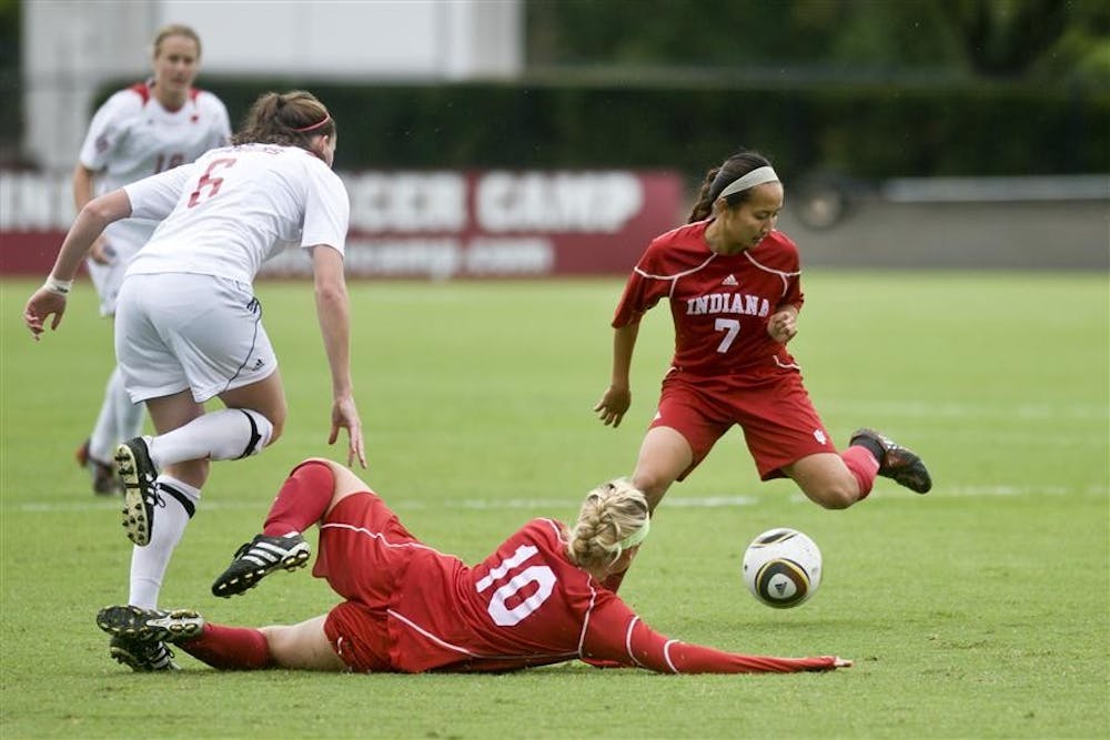 Freshman forward Rebecca Candler and freshman midfielder Lisa Nouanesengsy disposess Wisconsin's Meghan Flannery during IU's 1-0 overtime loss to the Badgers on Sunday at Bill Armstrong Stadium.