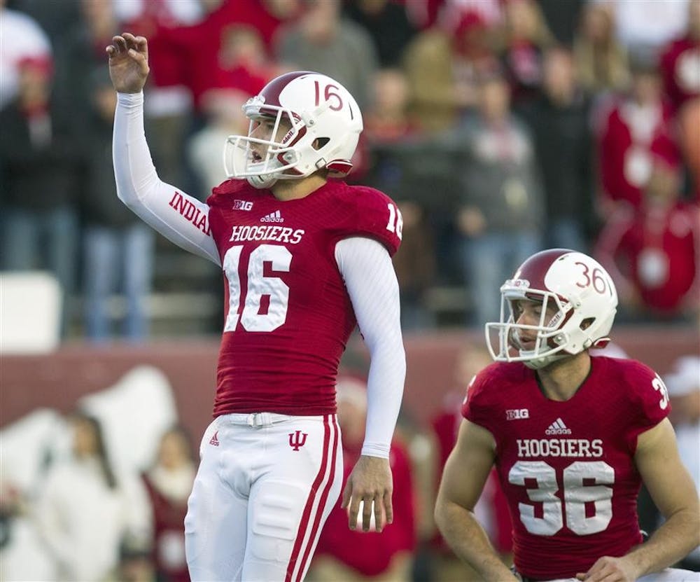 Senior Mitch Ewald watches the football after kicking a field goal during IU's 56-36 win over Purdue on Saturday at Memorial Stadium.