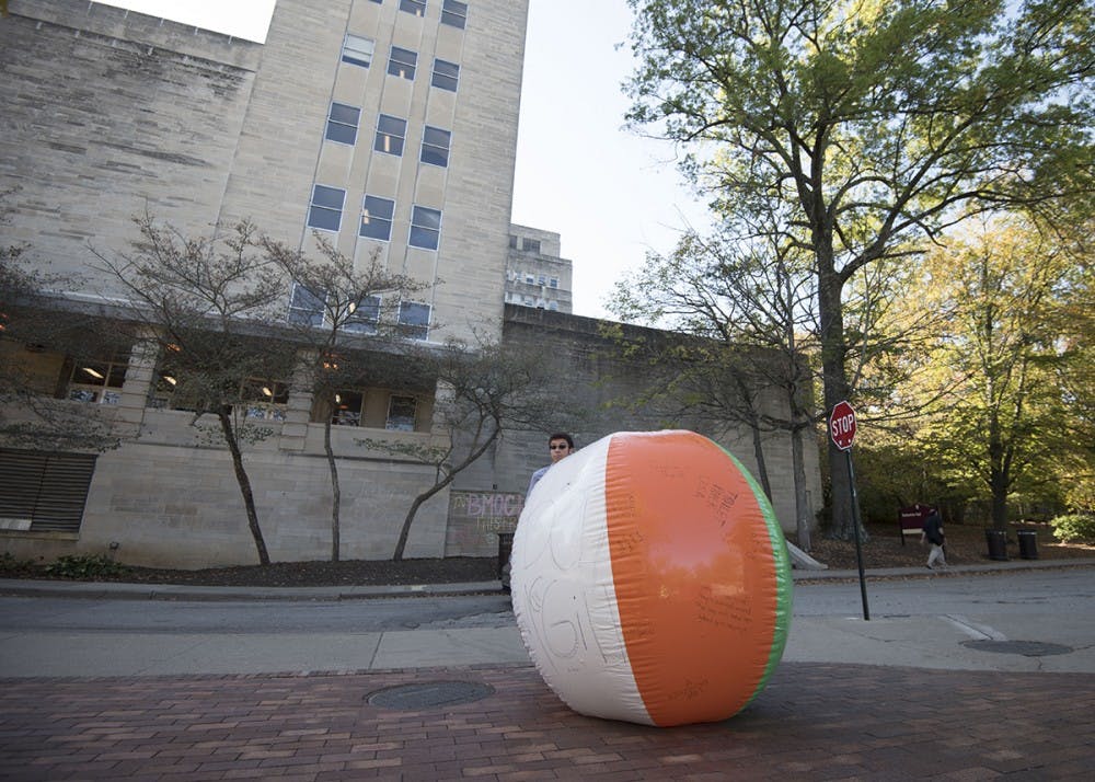 Young Americans for Liberty junior Tyler Combs holds the free speech ball outside Ballantine Thursday. The group asked people to sign the giant beach ball in the spirit of free speech.