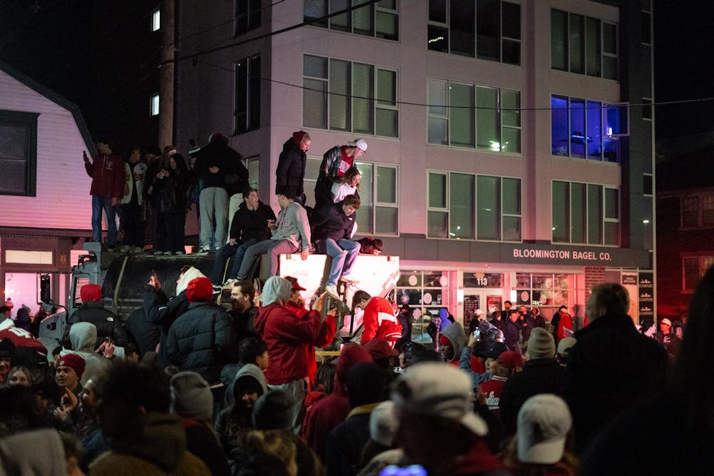 Students gather in the street after Indiana football's College Football Playoff National Championship win Jan. 19, 2026, on Kirkwood Avenue and Dunn Street in Bloomington. Alayna Wilkening