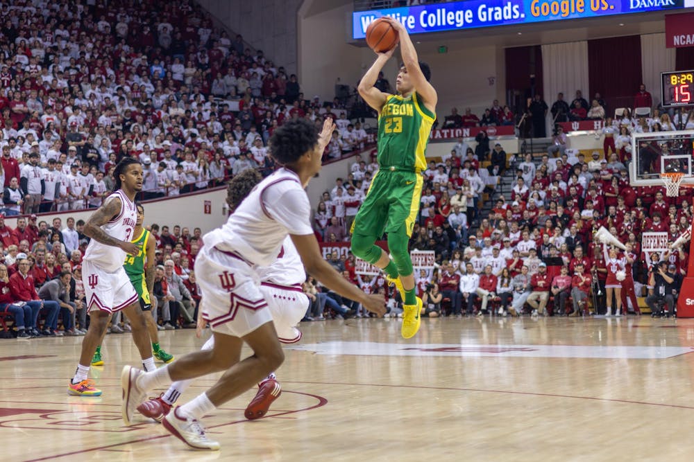 Indiana basketball players defend their side of the court during the game against Oregon on Feb. 9, 2026, at Simon Skjodt Assembly Hall in Bloomington. The Hoosiers had nine turnovers in the game.