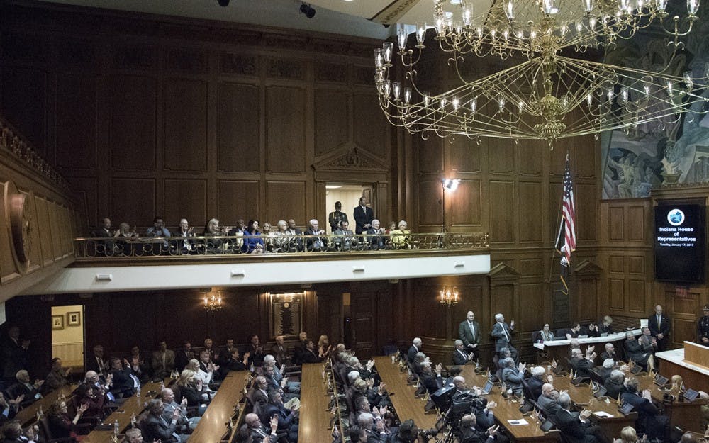 State legislators and guests clap for Governer Holcomb as he finishes his address. The State of the State address was given Tuesday night at the Indiana Statehouse in Indianapolis.