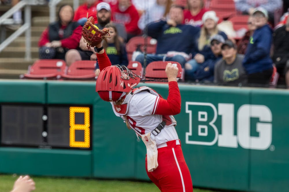 Senior catcher and utility player Avery Parker reaches to catch a foul ball in the game against Minnesota on March 7, 2026, at Andy Mohr Field in Bloomington. The Hoosiers defeated the Golden Gophers 5-0. Katie Newett