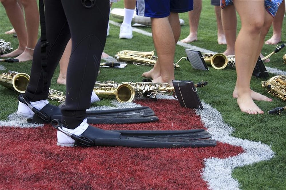 In line and ready, the Marching Hundred prepares to play in their Hawaiian gear on Thursday in Memorial Stadium.