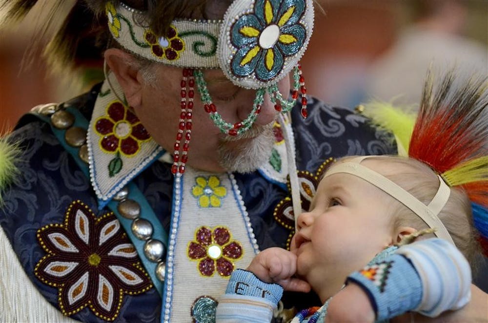 Dean Hugebeck cuddles his grandson, 9-month-old Everett Maniscalco, during a dance break at the "2nd Annual Traditional Powwow" event Saturday at Union Street Center. Hugebeck and his family travel from Cleveland, Ohio, and Eerie, Pa., to various powwows across the country at least once a month.