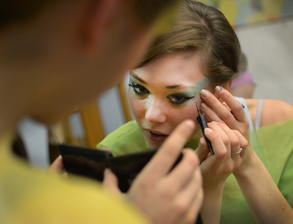 Olivia Huntley applies makeup shortly before the rehearsal for the University Gilbert and Sullivan Society's production of "Iolanthe" begins.