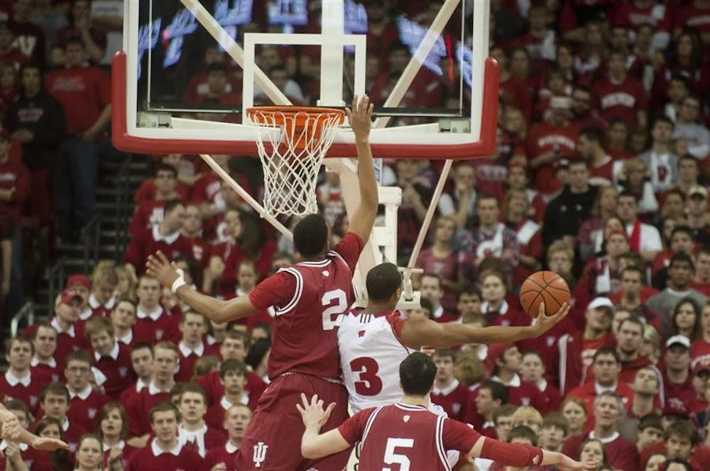 Wisconsin's Trevon Hughes attempts a layup over IU's Christian Watford during the Hoosiers' 83-55 loss to the Badgers Feb. 13 at the Kohl Center in Madison, Wisc. Peter Stevenson