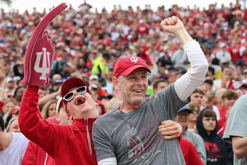 Two Indiana football fans cheer during the CFP quarterfinal game against Alabama on Jan. 1, 2026, at the Rose Bowl Stadium in Pasadena, California. The reported attendance was 90,278. Sophia Kaplan