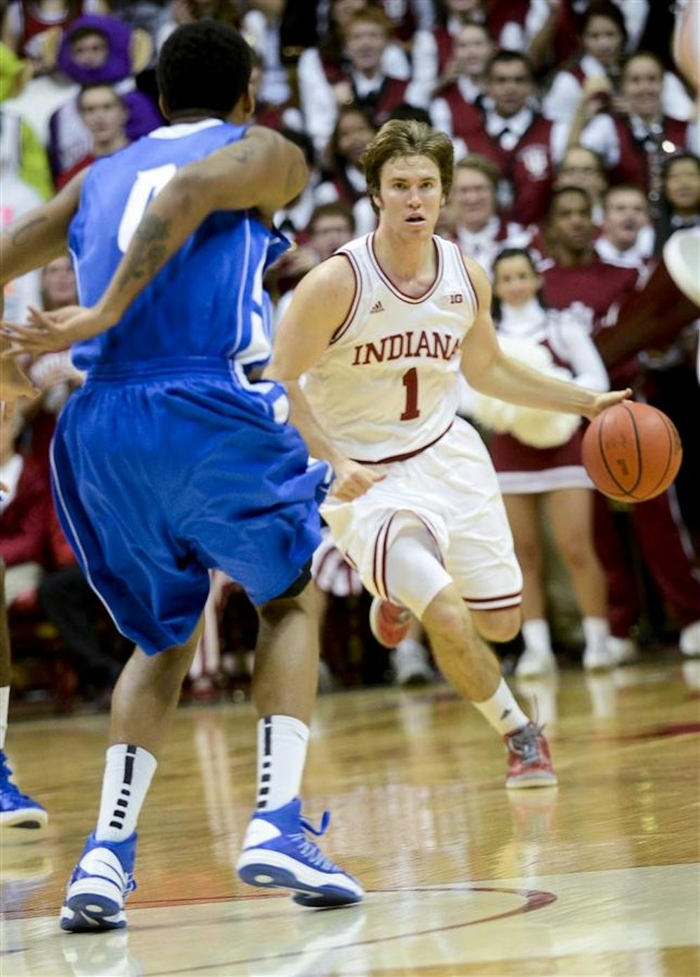 Senior guard Jordan Hulls dribbles the ball during the Hoosiers' 100-69 win against Central Connecticut State on Saturday at Assembly Hall. Steph Langan