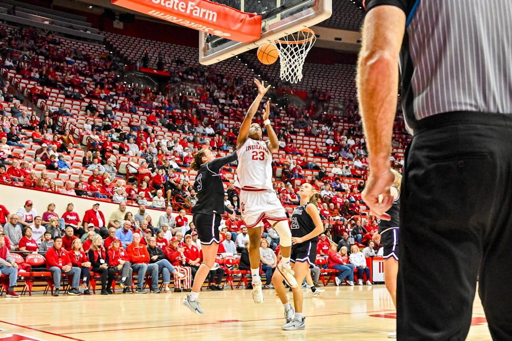 Sophomore forward Zania Socka-Nguemen finishes a drive during Indiana's 80-46 win over Lipscomb University on Nov. 4, 2025, inside Simon Skjodt Assembly Hall in Bloomington. Socka-Nguemen finished the game with 19 points. Alex Coifman